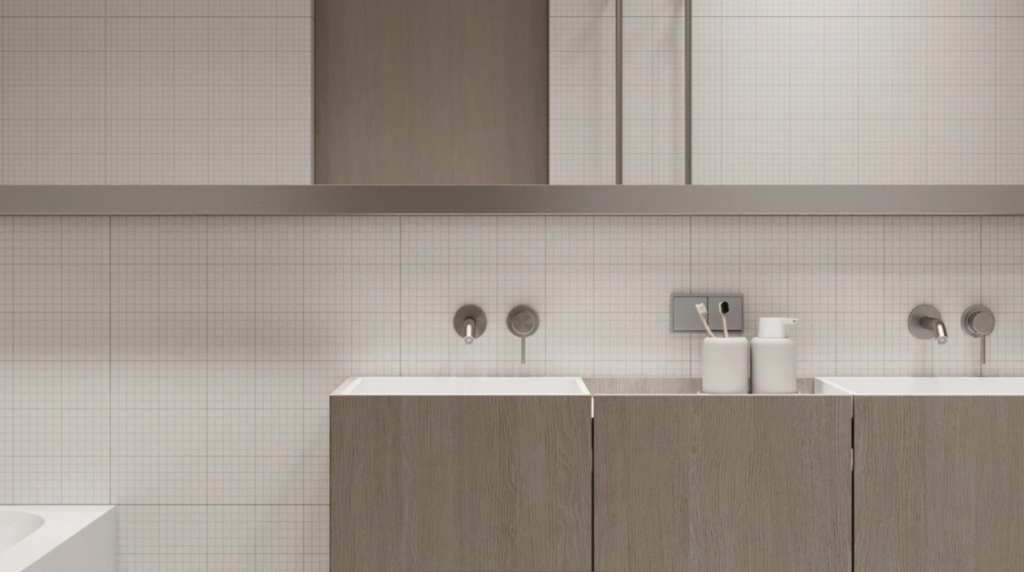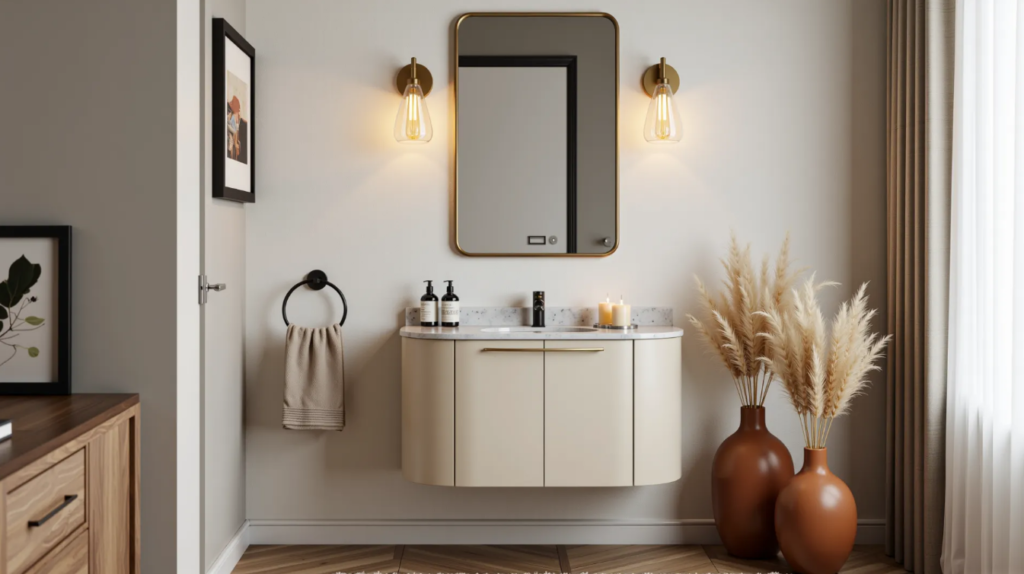 Humans have an instinctive affinity for natural materials. Wooden tones subconsciously convey feelings of safety, relaxation, and balance, making them particularly suitable for spaces that require a calming atmosphere, such as bathrooms and bedrooms. For small spaces, it’s best to use light wood tones to avoid visually compressing the space; pairing them with white, beige, or light gray is the safest option. Concentrate the wood tones on cabinets, niches, or specific wall sections, avoiding mixing multiple wood colors to maintain a more sophisticated and unified look. As shown in the image, the shelving unit, mirror frame, and vanity all use the same natural wood color, complemented by greenery, creating a pleasant and harmonious feeling.