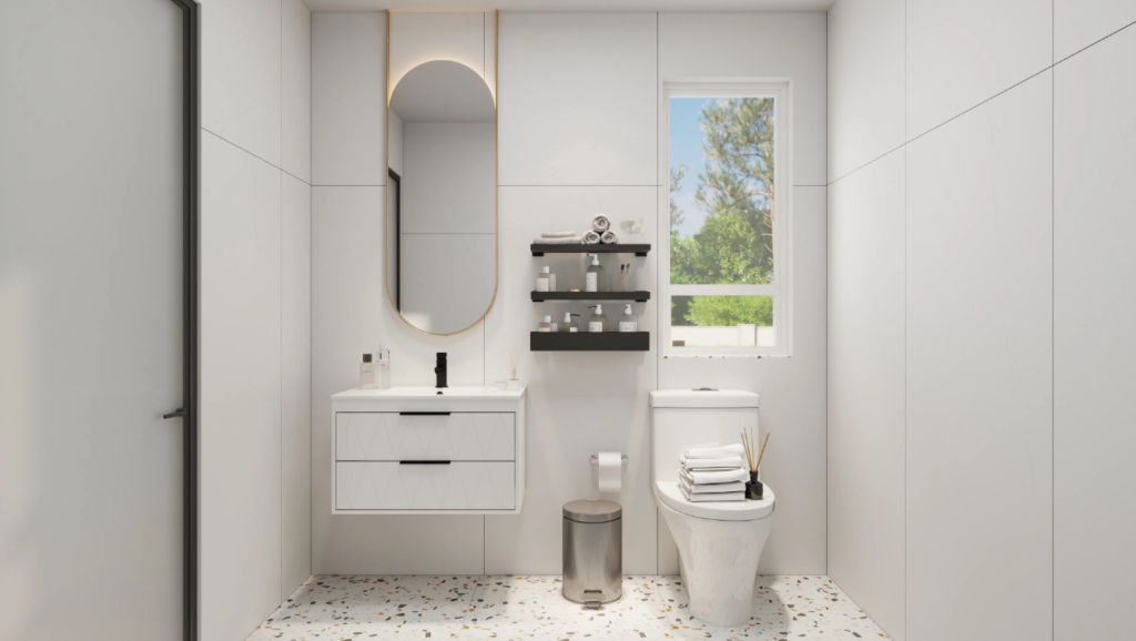 When choosing colors for a small bathroom, the large areas such as the toilet, walls, and floor will significantly impact the overall impression. Therefore, it’s best to use white or light colors for these areas. For accents like mirror frames, shelves, or trash cans, you can use silver, gold, or black to add visual interest and create a spacious and layered look without sacrificing brightness.