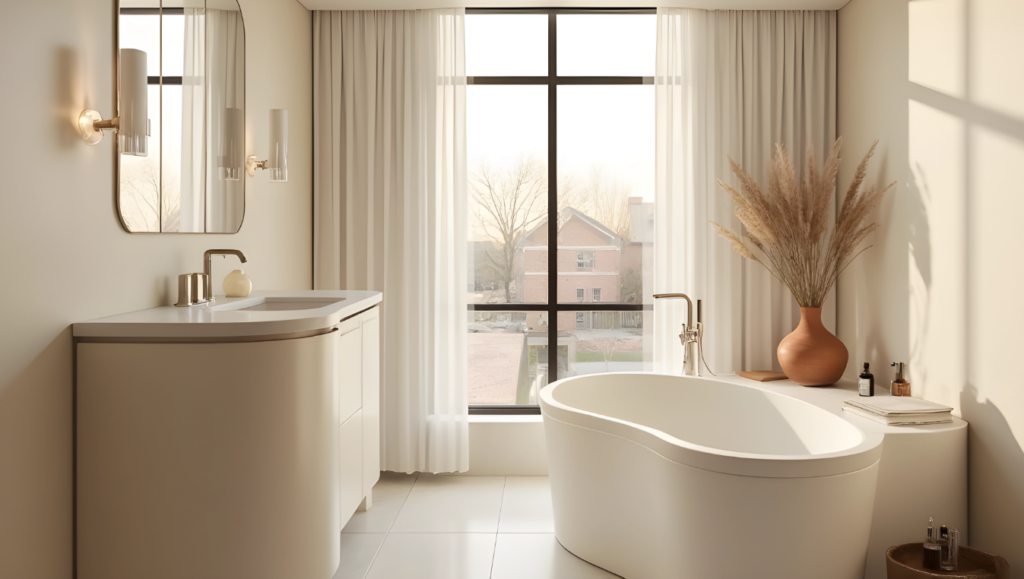 Light colors are the safest and most effective choice for small bathrooms. White, off-white, and cream colors maximize light reflection, making the space appear larger and cleaner. This bathroom design features warm and soft tones, creating a relaxing and comfortable atmosphere. White sheer curtains and dried flowers further enhance the warm and natural feel of the space. The entire bathroom seems to soothe fatigue and bring peace and tranquility to both body and mind.